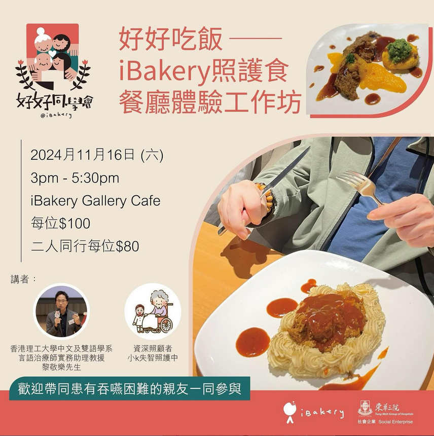 唔少照顧者帶同長者外出用膳時,往往都沒有合適食物,每次都要額外備餐。iBakery金鐘餐廳經過近半年研發,即將推出兩款全新照護食餐膳。今次活動,誠邀各位照顧者成為首批食客,率先試食、交流意見外,亦邀請言語治療師及資深照顧者 小K失智照護中,分別講解吞嚥困難知識,以及分享平日外出用餐的經驗及心得。